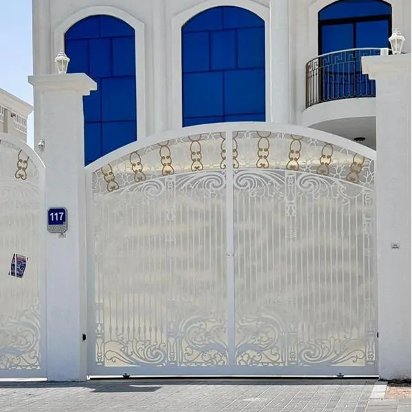 باب حديد مشغول يتميز بطابع هادئ وخفيف مصمم باجود الخامات وافضل انواع الصبغ المقاوم لعوامل الجو الرياح والامطار